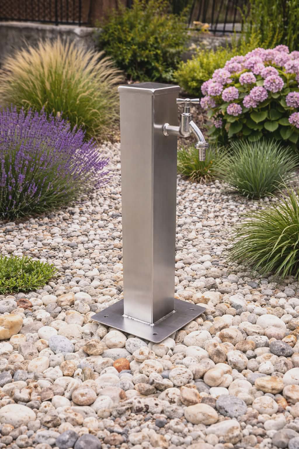 Voľne stojací stĺpik na vodu je vyrobený s kartáčovanej nerezovej ocele.